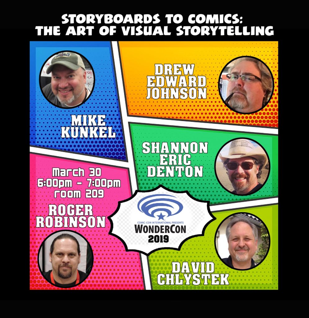 “Storyboard and comic book artists Shannon Eric Denton (Deadpool, Batman),Roger Robinson (Batman, Halo), Mike Kunkel (Hero Bear, Spider-Man), Drew Edward Johnson (Wonder Woman, Guardians of the Galaxy), and David Chlystek (X-O Manowar, Guardians of the Galaxy) explore the power and potential of visual storytelling across media. The panel will present examples of comics and storyboards used to impact readers and empower cinematography. The panelists will discuss incorporating a dynamic approach to storytelling in both comics and film while clearly defining the differences between the two mediums. Print, television, film, games, and other media all benefit from visual storytelling and now you can too.”